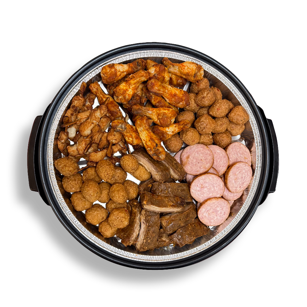 Een gevarieerde partypan gevuld met verschillende warme vleesgerechten, perfect voor feestjes of gezellige borrels. Makkelijk op te warmen en direct te serveren.